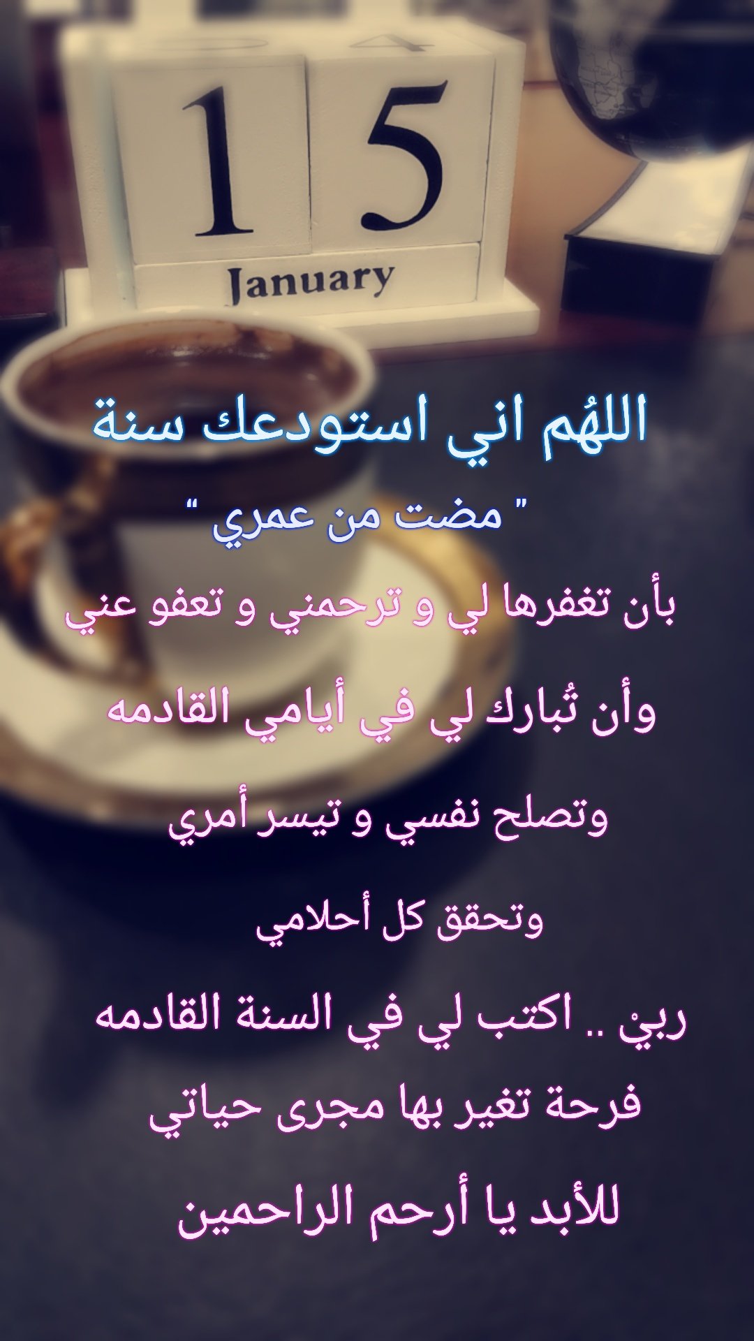 الله م إني أستودعك سنة مضت من عمري بأن تغفرها لي و ترحمني وتعفو عني وان ت بارك لي في أيامي القاد مة وتصلح نفسي و ت يسر أمري.