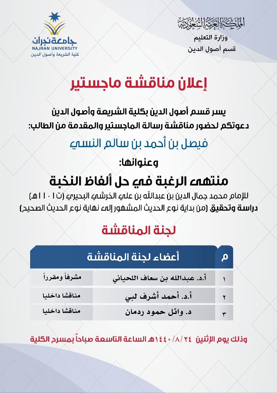إعلان مناقشة رسالة الماجستير في الحديث وعلومه للطالب فيصل بن أحمد بن سالم النسي