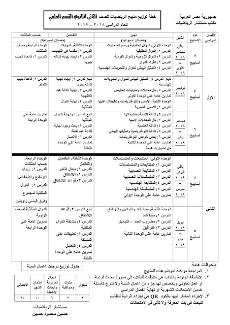 توزيع منهج الرياضيات للصف الثانى الثانوى علمى وأدبى 2019